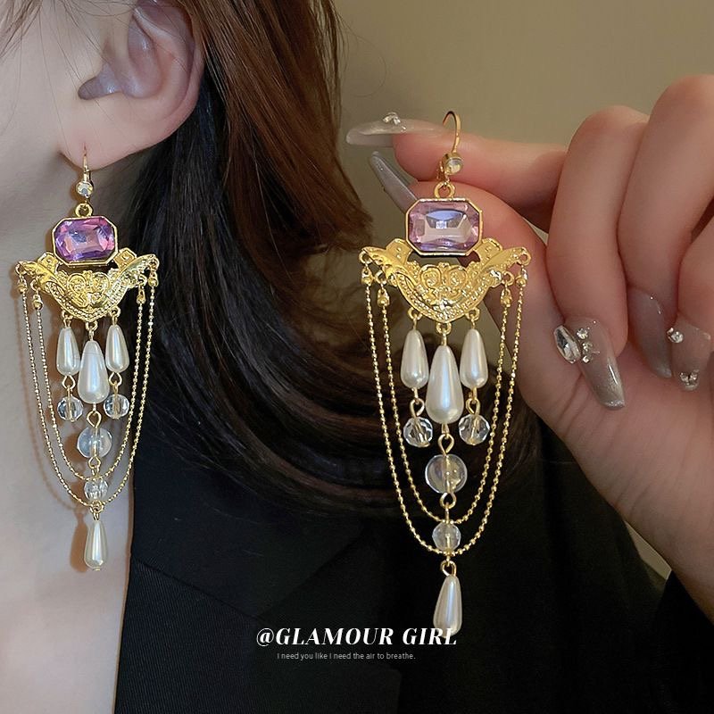 Diamond-encrusted pearl crystal tassel French retro earrings