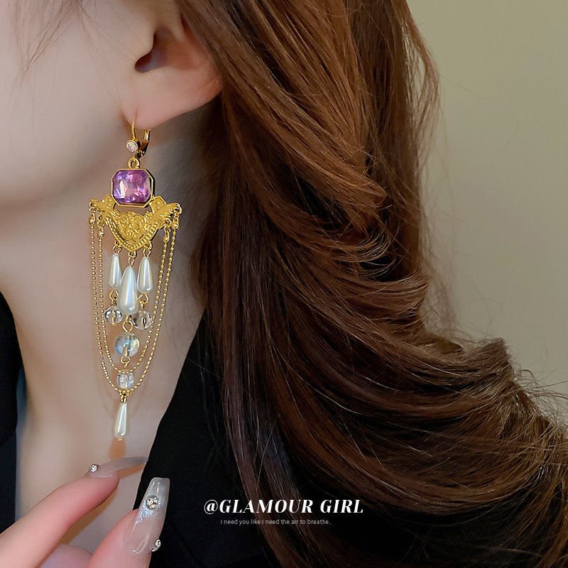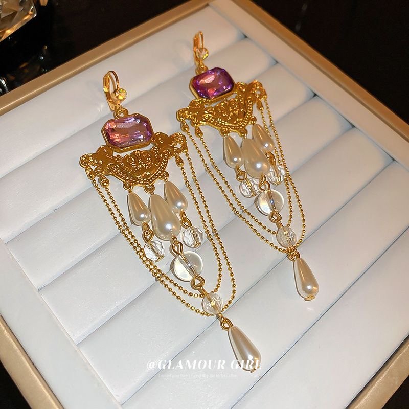 Diamond-encrusted pearl crystal tassel French retro earrings quantity