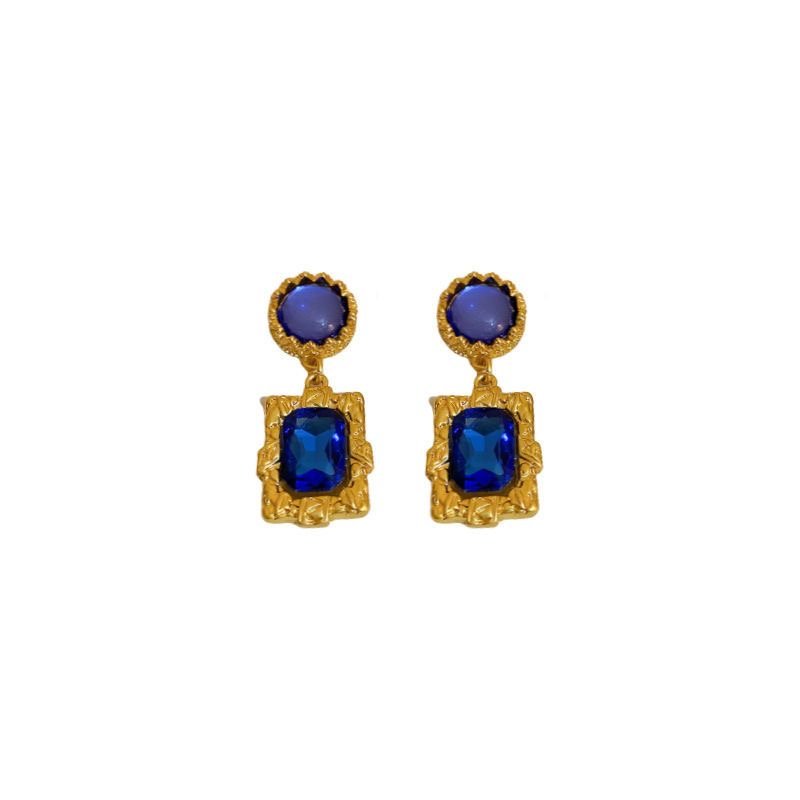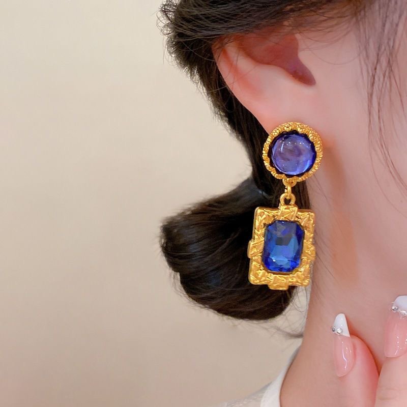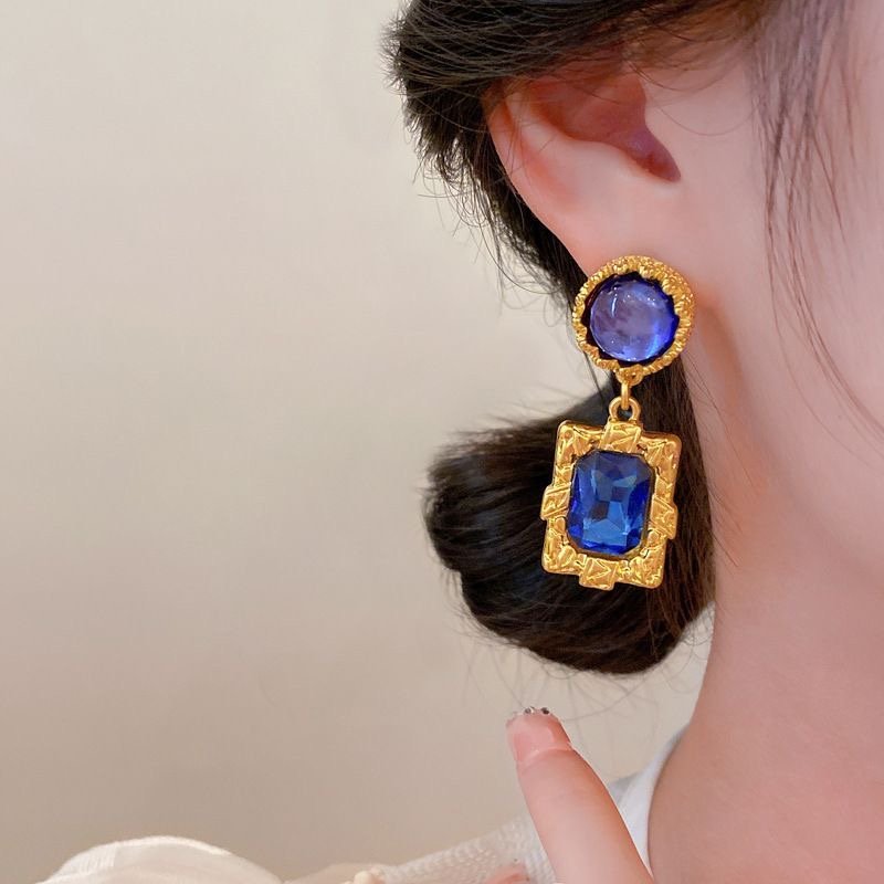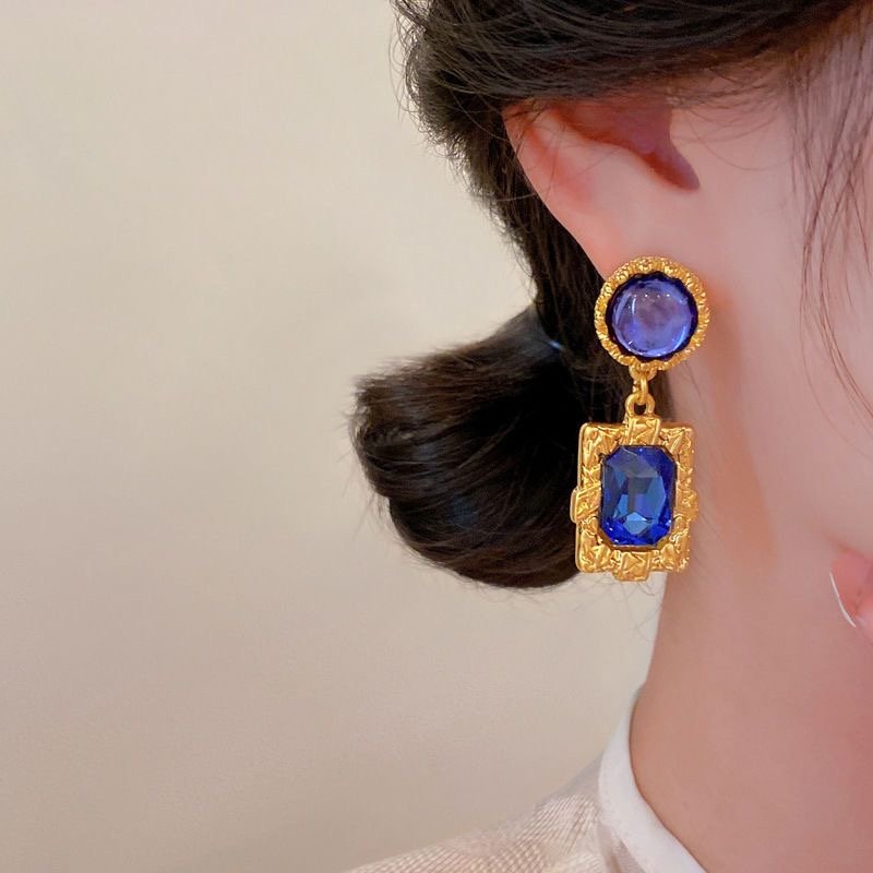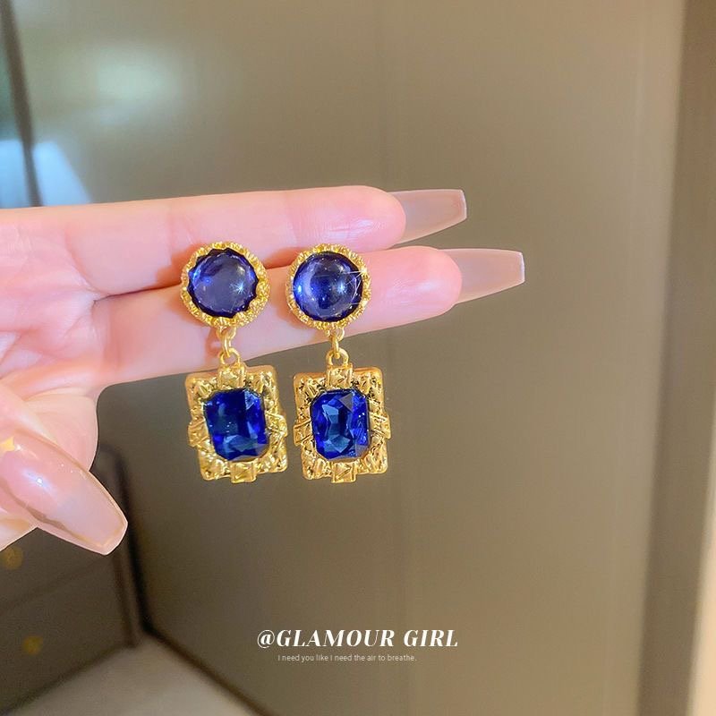 Silver needle dark blue diamond earrings retro